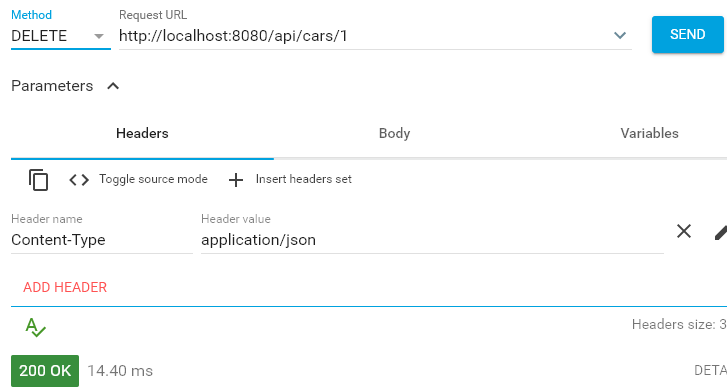 PUT 수정 요청과 마찬가지로 해당하는 ID 를 가진 데이터를 삭제할 것이기 때문에 URL의 마지막에 ID 가 붙는다.