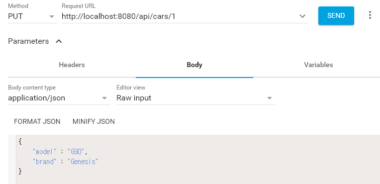 PUT 방식으로 ID 가 1인 데이터를 G90 차량으로 변경 해 보았다.