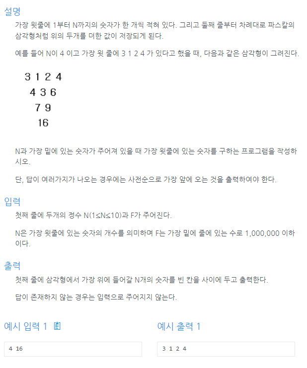 일 때, int배열 combinationArr 와 ans 의 같은 인덱스 값들을 곱한 합이 F와 같은 것이 나올 때까지 DFS를 활용해 답 ans 를 구하면 된다