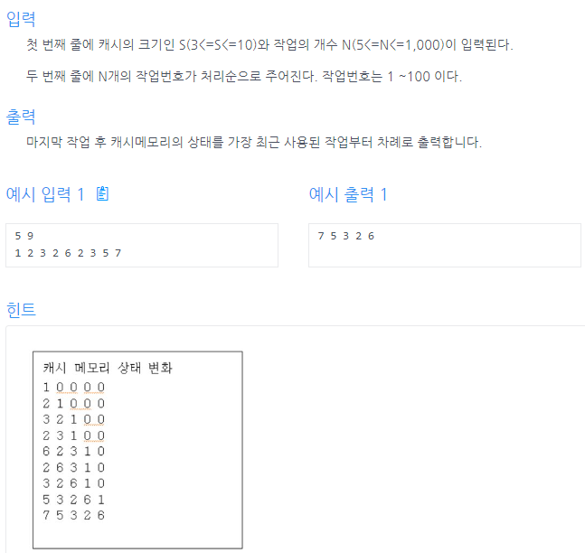- 캐시 안에 없을 경우 → 전부 오른쪽으로 한 칸씩 땡긴 뒤 앞에 추가