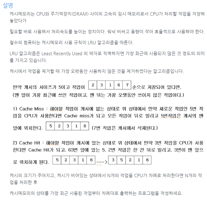 - 캐시 안에 있을 경우 → 현재 index 전까지 오른쪽으로 한 칸씩 땡긴 뒤 맨 앞으로 넣기