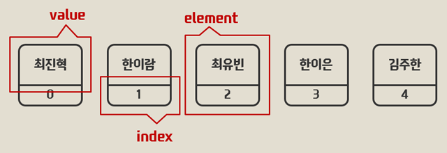 - Array의 index는 각 value에 대한 유일한 식별자이다. (0부터 시작) 단순히 몇 번째인지를 나타내는 List의 index와는 다르다.