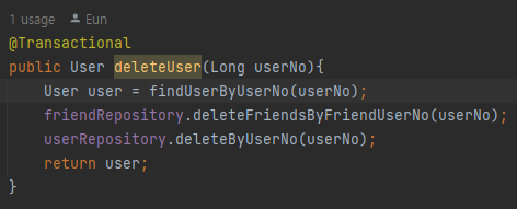 DB상의 Friend들 중 삭제될 User의 userNo를 갖고있는 Friend(FriendUser)들을 삭제하는 방법으로 해결했다.