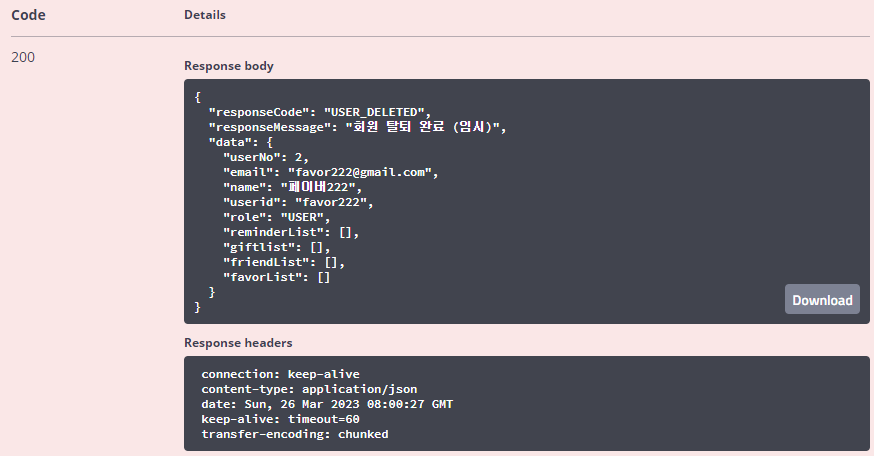 하지만 User “페이버222”를 삭제해도 User “페이버111”의 friendList에서 사라지지 않는 이슈가 있었다.