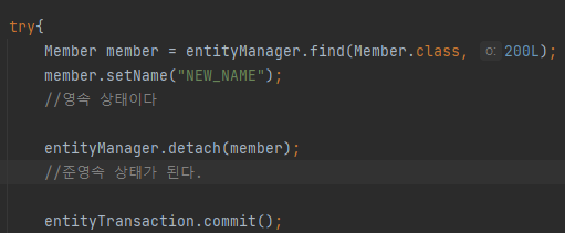 - 영속 상태의 엔티티가 영속성 컨텍스트에서 분리된 상태이다. (detached)