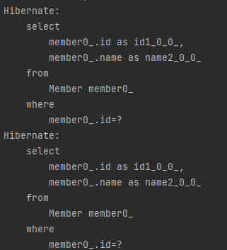 중간에 entityManager.clear() 때문에 1차 캐시가 초기화되어서 SELECT 쿼리가 한번 더 실행되는것을 확인할 수 있다.
