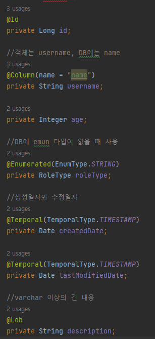 - @Transient : 특정 필드를 컬럼에 매핑하지 않음(매핑 무시), DB랑 관계 없이 메모리에서만 사용한다.