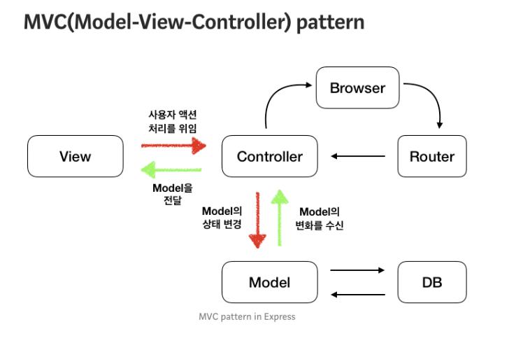 - Contoller : Model에서 데이터를 받아 View로 전달해주거나 View에서 들어온 요청을 해석해 Model을 변경한다.