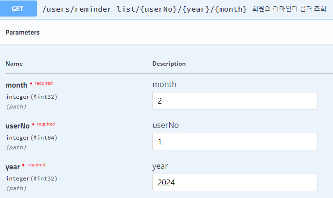 - 유저의 식별자와 찾고자 하는 리마인더의 년도와 월을 파라미터로 받는다.