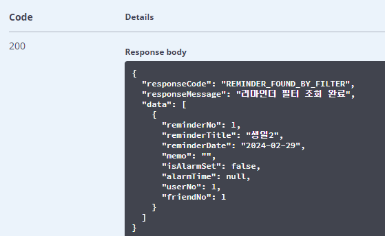 - JPA를 활용해 start 날짜와 end 날짜 범위에 해당하는 reminderDate 값을 갖는 Reminder 리스트를 반환하도록 Repository 내에 정의해놓았다.